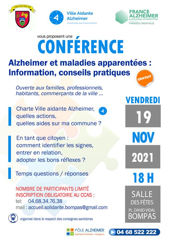 Cette conférence sera animée par M. Guy Le Rochais, Président de l’association France Alzheimer P.O, Mme Christine Mignon, Responsable du Point Accueil Solidarité et Mme Olga Laghmari Psychologue de la Plateforme de répit et d’accompagnement des aidants familiaux. La présentation sera suivie d’un temps d’échange avec les intervenants.