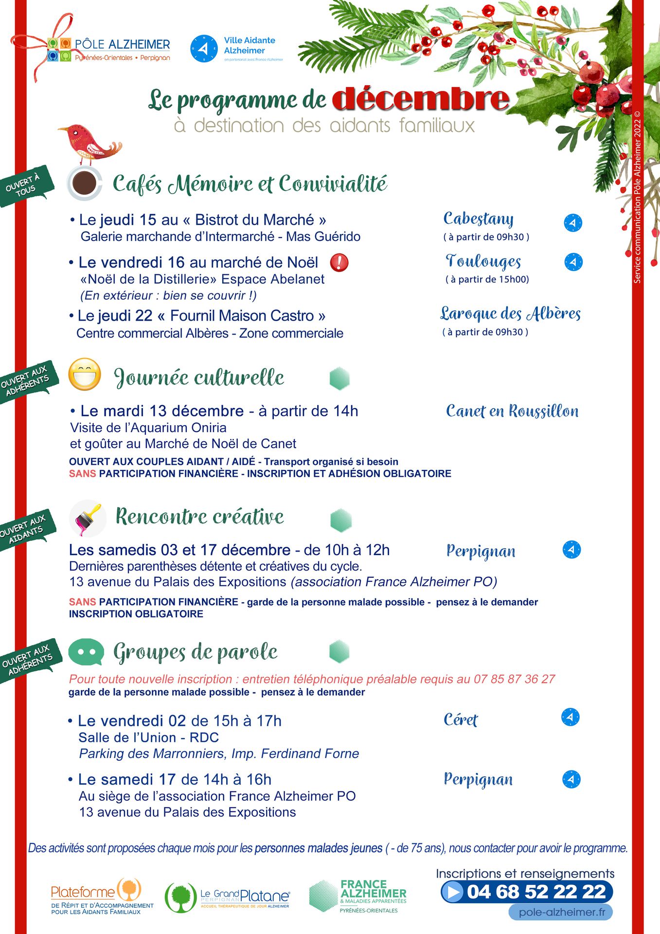 Programme des activités du Pôle Alzheimer du mois, n'hésitez pas à partager ces informations